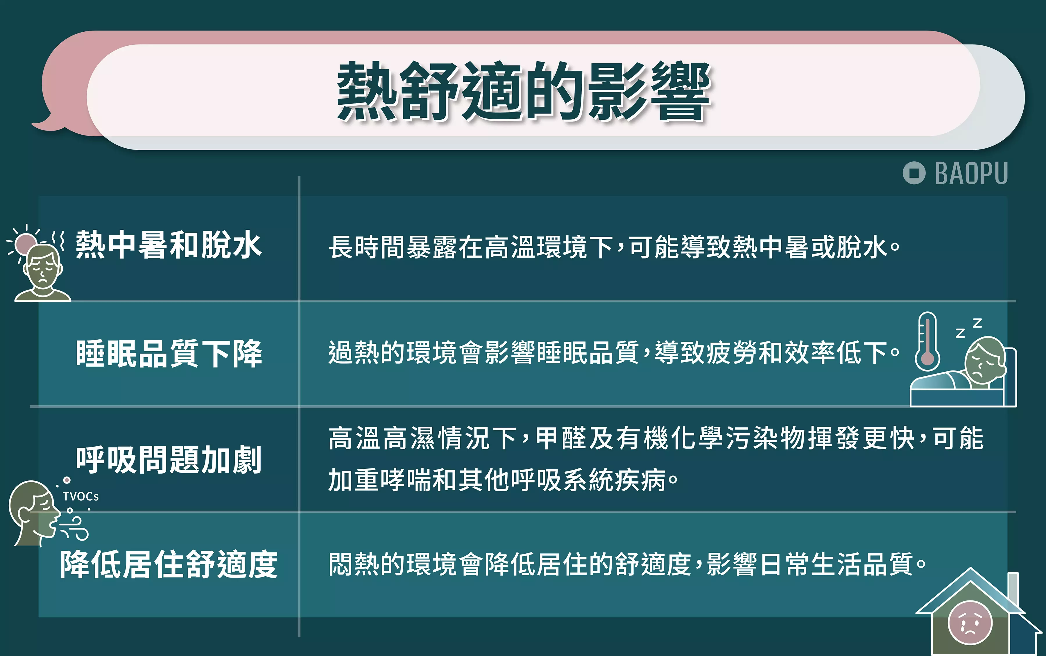 熱舒適的影響包括:熱中暑和脫水、睡眠品質下降、呼吸問題加劇、降低居住舒適度。