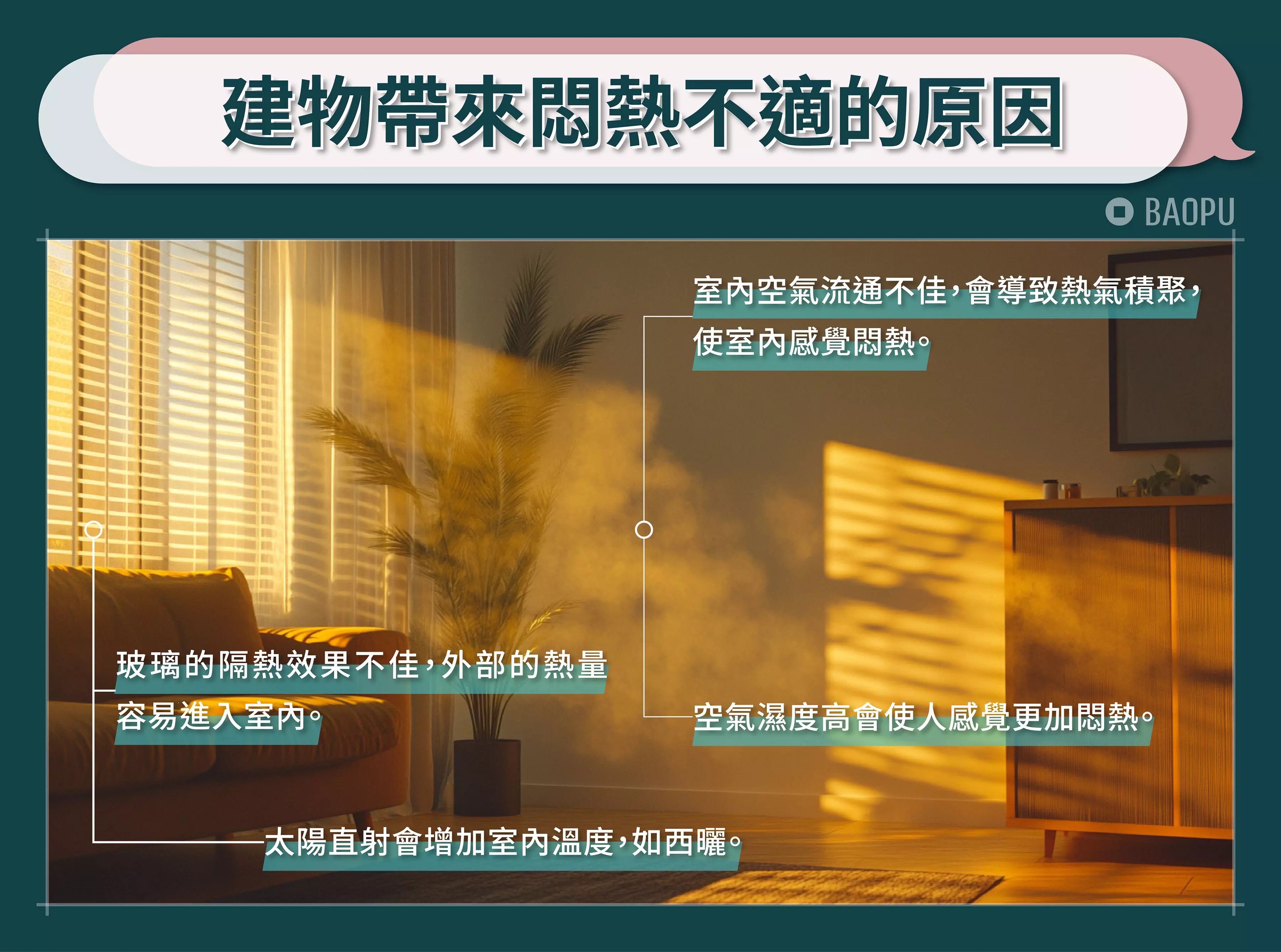其實不只西曬這個因素,影響室內悶熱的原因很多,建物帶來悶熱不適原因如下: