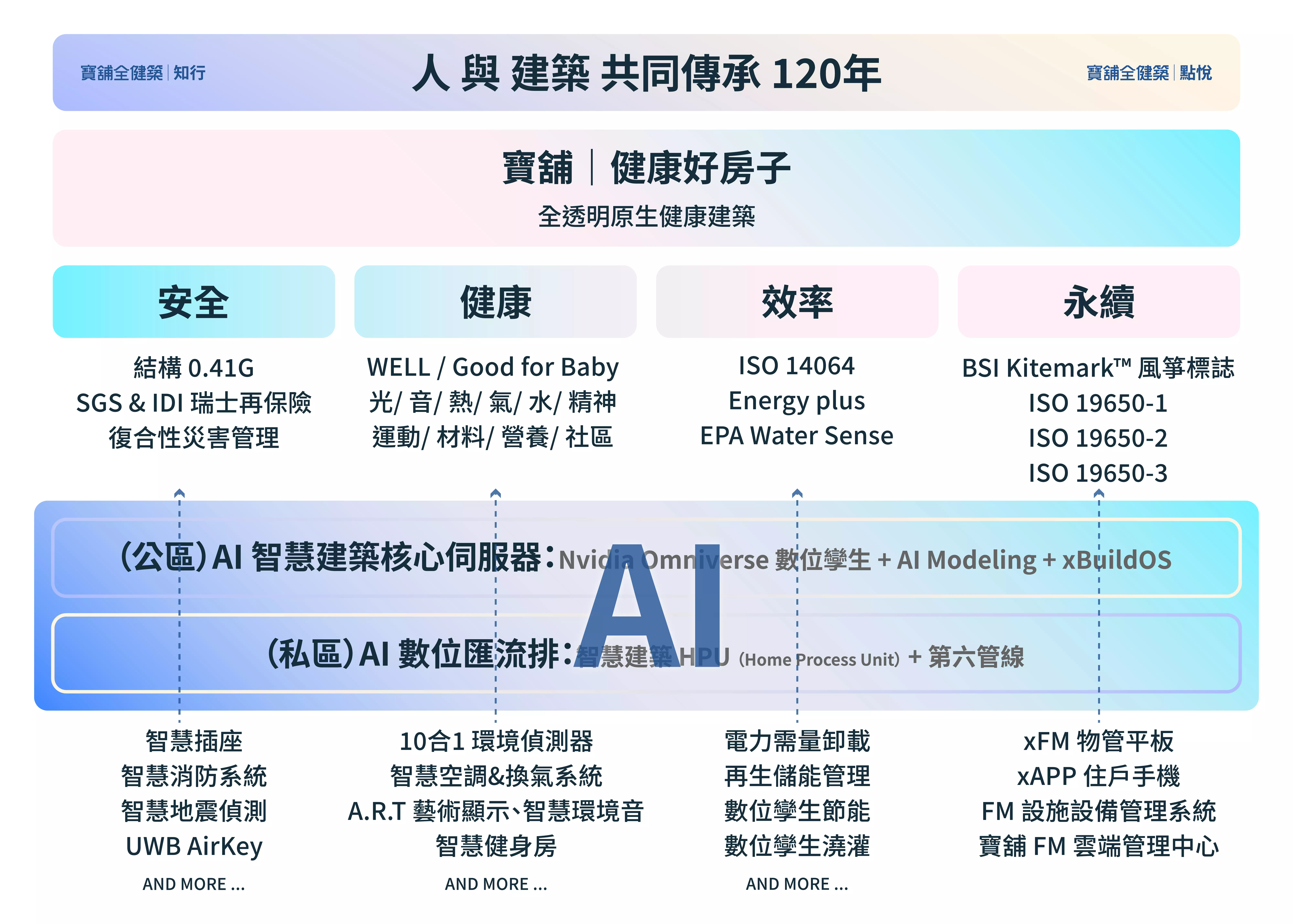 「寶舖全健築」系列推案的「AI 智慧健築」更將全生命週期數據匯入 NVIDIA Omniverse,結合BIM、AIoT與雲端平台,內建「智慧建築核心伺服器」,整合所有智慧系統,支援「全生命週期管理系統」優化居住生活體驗,帶來前所未見的智慧住宅模式!不僅如此,「寶舖全健築」更透過 OTA(Over-the-Air 進化更新)與 AI 模型學習讓建築保持最新狀態,預演及優化建物每個細節,長久守護居住的健康與安全。