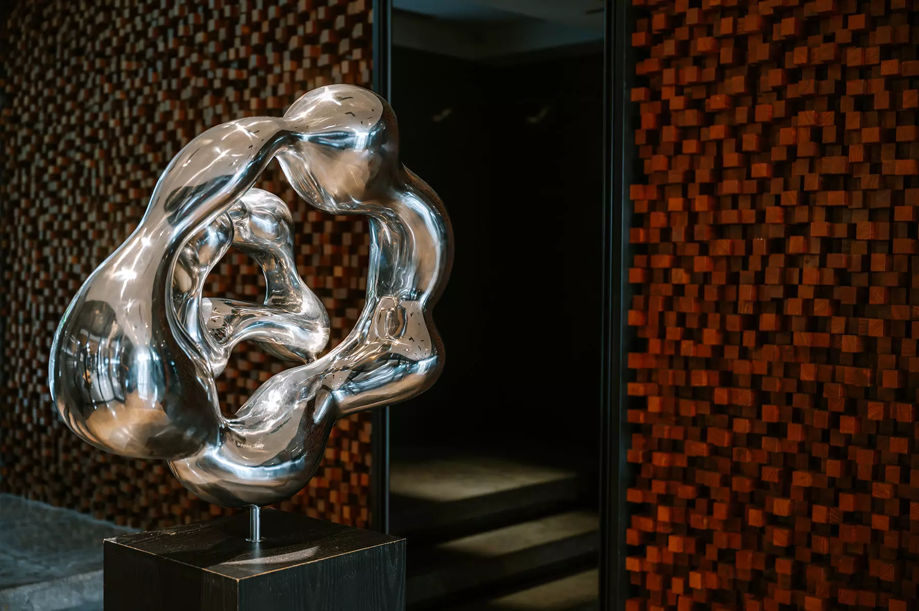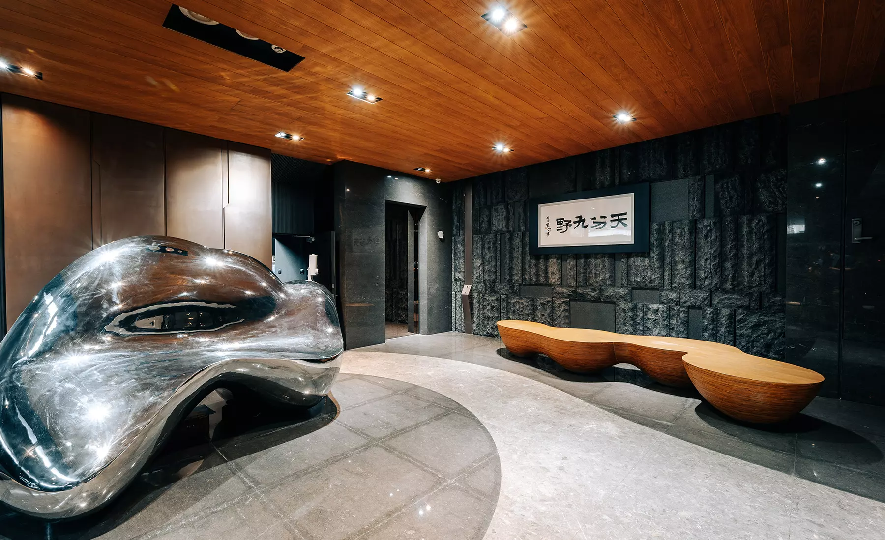 雕塑藝術家姜憲明喜歡石頭經過打磨過後表現出來的結晶質感,他常說:「大自然就是我的創作來源。」靈感取之於自然,其雕塑藝術更是飽含洗鍊的智慧,蘊藝於型,作品「祥雲樹海」展於「九野」一景,流動著大巧若拙的空間逸境。